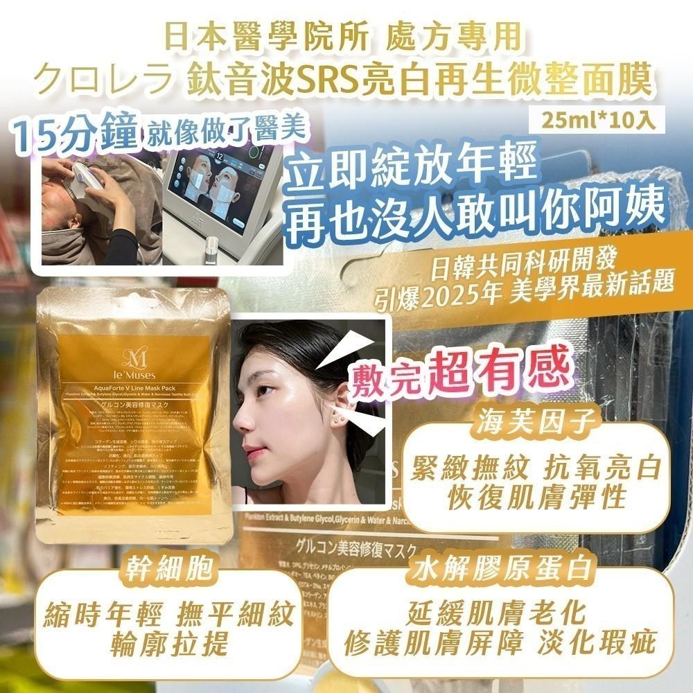 ⏰截單 : 20/10 23:00 🔜預計到貨:約12月底 ⛔空運/海運可能因各種不明因素影響而延誤到港,如不能接受者請勿下單🙇🏻♀ 📌溫馨提示: 圖片由供應商提供只供參考實品,一切以實物為準 🇯🇵 日本醫學院所 處方專用 ✨ クロレラ 鈦音波SRS亮白再生微整面膜 ✨ 📦 25ml*10入 🔥 2025下半年 亞洲美容圈最新風暴 💬 討論度爆棚 💎 橫掃銷量寶座 No.1 🚀 業界唯一首創「 用敷的音波面膜 」 🌐 全球最新專利 — Aquaforte V ✔️使用方式:清潔完臉部,取出本品,服貼於臉部10-15分鐘,撕下面膜,將多餘精華輕柔按摩至吸收 🤝 日韓共同科研開發 💥 引爆2025年 美學界最新話題 💆♀️ 收緊下垂垮臉 👉 看起來超年輕 ✨ 用過都驚呼:皮膚越來越緊緻了! 🕰 讓肌膚穿越時空 🔄 修護再生 逆齡緊緻 😱 不小心變老也能救回來 👑 榮登人間最強 抗老封神之作 💎 有錢也買不到的醫能級面膜 🏥 醫美處方專用 全台唯一合作販售 🇰🇷 韓國江南 整形醫美權威 指定推薦 ⚡ 太扯!48小時 熱銷超過百萬片 👩🔬 緊緻度決定 90% 的年輕 💃 輪廓線決定 100% 的高級 ⏱ 15分鐘 就像做了醫美 敷完超有感 🌟 終結蠟黃暗沉 喚醒核心細胞再生 ✨ 立即綻放年輕 🙅♀️ 再也沒人敢叫你阿姨 💎 海芙因子 — 緊緻撫紋、抗氧亮白、恢復肌膚彈性 💎 水解膠原蛋白 — 延緩肌膚老化、修護肌膚屏障、淡化瑕疵 💎 幹細胞 — 縮時年輕、撫平細紋、輪廓拉提 ✴️商品進口運輸過程,外盒擠壓為不可抗力之因素,不影響商品本身使用,若不介意者再下單 謝謝