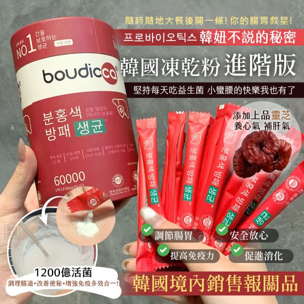 ⏰截單 : 14/12 23:00 🔜預計到貨:約2月底 ⛔空運/海運可能因各種不明因素影響而延誤到港,如不能接受者請勿下單🙇🏻♀ 📌溫馨提示: 圖片由供應商提供只供參考實品,一切以實物為準 ❤️ 韓國 高規格「小粉盾」益生菌 腸道健康の進階守護者 賣爆的益生菌粉 出了最高進階版啦~ 靈芝添加,養肝護肝 根本就是專為現代‘’暗共覺‘’準備來的!! 顧腸護胃又養肝! 因為效果讓人滿意 這款市面整個大缺貨啦~ 我們獨家升級第二代 我們獨家升級第二代 我們獨家升級第二代 成分升級不加價!! 小韓排名第一的益生菌!50條一整桶,真的超狂! ✅ 來自韓國恩妍株式會社+首爾醫研中心聯合研發 🌿 專為亞洲人設計|11大專利菌株+靈芝精華 除了瘦瘦菌是基本標配 養成不易胖體質 ✔ 60000億CFU活菌/盒|業界最高活性,一條=12杯優格 ✔ 凍乾粉技術|耐胃酸膽鹼,直達腸道存活率99% ✔ 靈芝+益生元|雙效調節「腸肝軸」,養腸更護肝 ✔ 50條隨身包|大餐後、出差時,隨時維持腸道平衡 🔥 韓國爆賣理由|3大科技突破 源自11株專利益生菌 特別強化「擬桿菌屬」,精準調節腸道菌叢比例 三層微膠囊包埋,抵抗胃酸侵蝕 活性留存率較常規產品高3倍 添加靈芝萃取 同步改善腸躁、提升睡眠品質 💖 特別推薦給 ▸ 外食族|快速分解油膩飲食 ▸ 久坐族|改善「青蛙肚」困擾 ▸ 熬夜黨|靈芝護肝+腸道排毒 ▸ 熟齡族|強化黏膜免疫屏障 📌 聰明食用法 ⏰ 黃金時段:早餐前空腹食用 🍵 加強搭配:40°C以下溫水沖服 🚫 禁忌:與抗生素間隔2小時 來源:韓國空運(PRC代工) 內容物:50支入