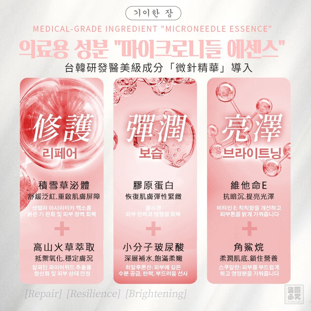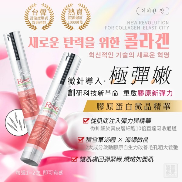 ⏰截單 : 15/12 23:00 🔜預計到貨:約2月底 ⛔空運/海運可能因各種不明因素影響而延誤到港,如不能接受者請勿下單🙇🏻♀ 📌溫馨提示: 圖片由供應商提供只供參考實品,一切以實物為準 ❤️韓國奇麗庄-極彈嫩膠原蛋白微晶精華 韓國最夯的一瓶 利用微針將膠原導入皮膚‼️ 輕熟女都愛用 藥妝店銷售前幾名‼️‼️ 超導技術 ✨吸收很快,後續保養更順、更服貼 使用後的彈潤感! ☁️肌膚變得柔柔嫩嫩、膚觸更平滑☁️ 幾天後連上妝也不卡粉,妝感更服貼 同等成分的精華都要價五六百 🉐️🉐️🉐️團購獨享一瓶$139 🌟愛上它的關鍵3元素👇 1️⃣ 海綿微晶技術 幫助保養成分有效吸收 2️⃣ 積雪草外泌體 + 高山火草萃取 溫和呵護,穩定膚況 3️⃣小分子玻尿酸 + 膠原蛋白 保濕鎖水、提升肌膚彈潤感 💧不只是保養,更像幫肌膚充電⚡ 📌肌膚觸感更柔、更穩定、更有光澤🌙 一瓶多效,為你的夜間保養精簡又有效率! 早一步保養,就是好狀態的秘密 幫肌膚打好底,展現自然透亮光采🌸 🔍產品資訊🔍 產地:台灣生醫製造 品牌:韓國 (台灣代工) 容量:30ml(±5%)